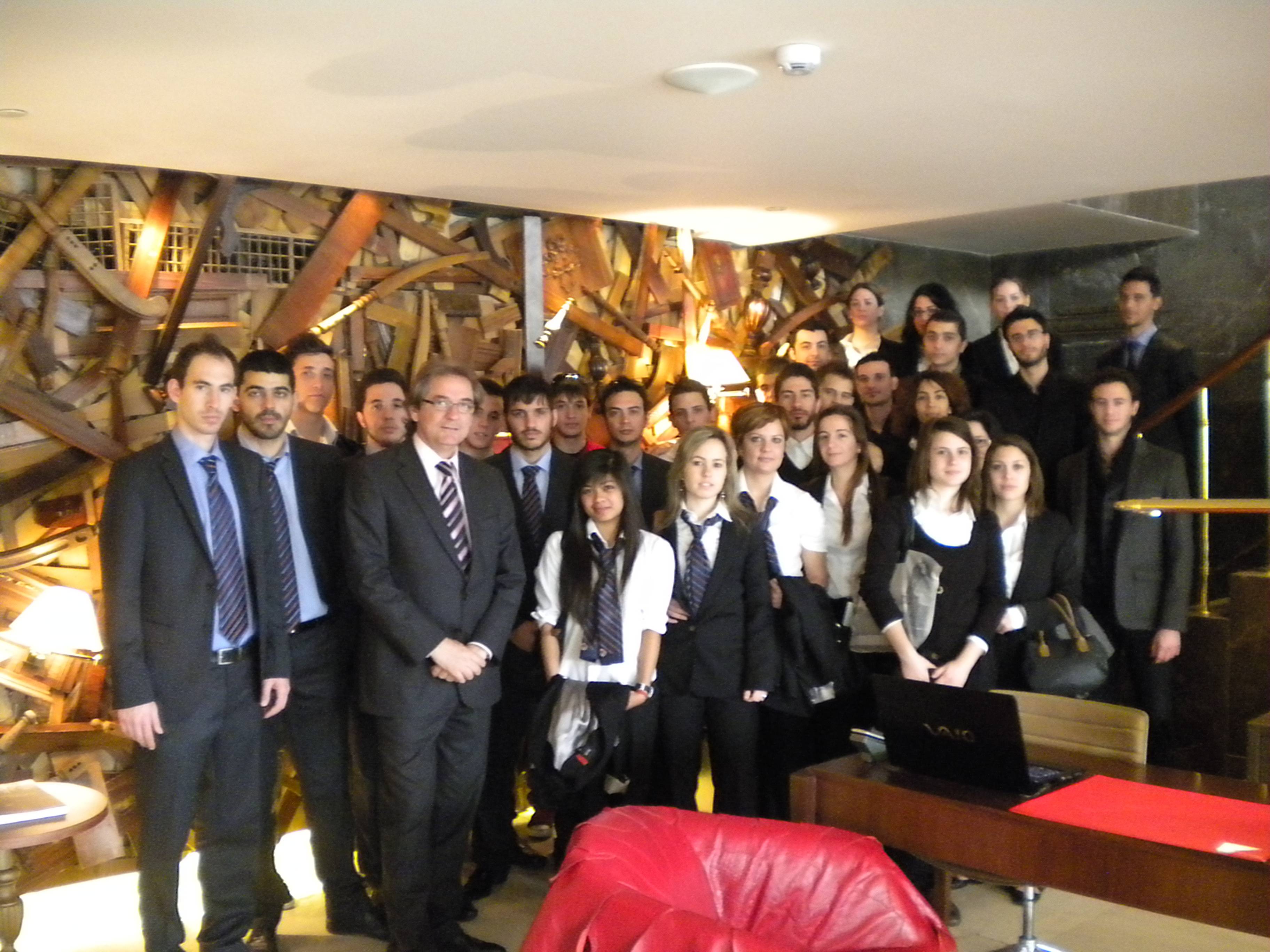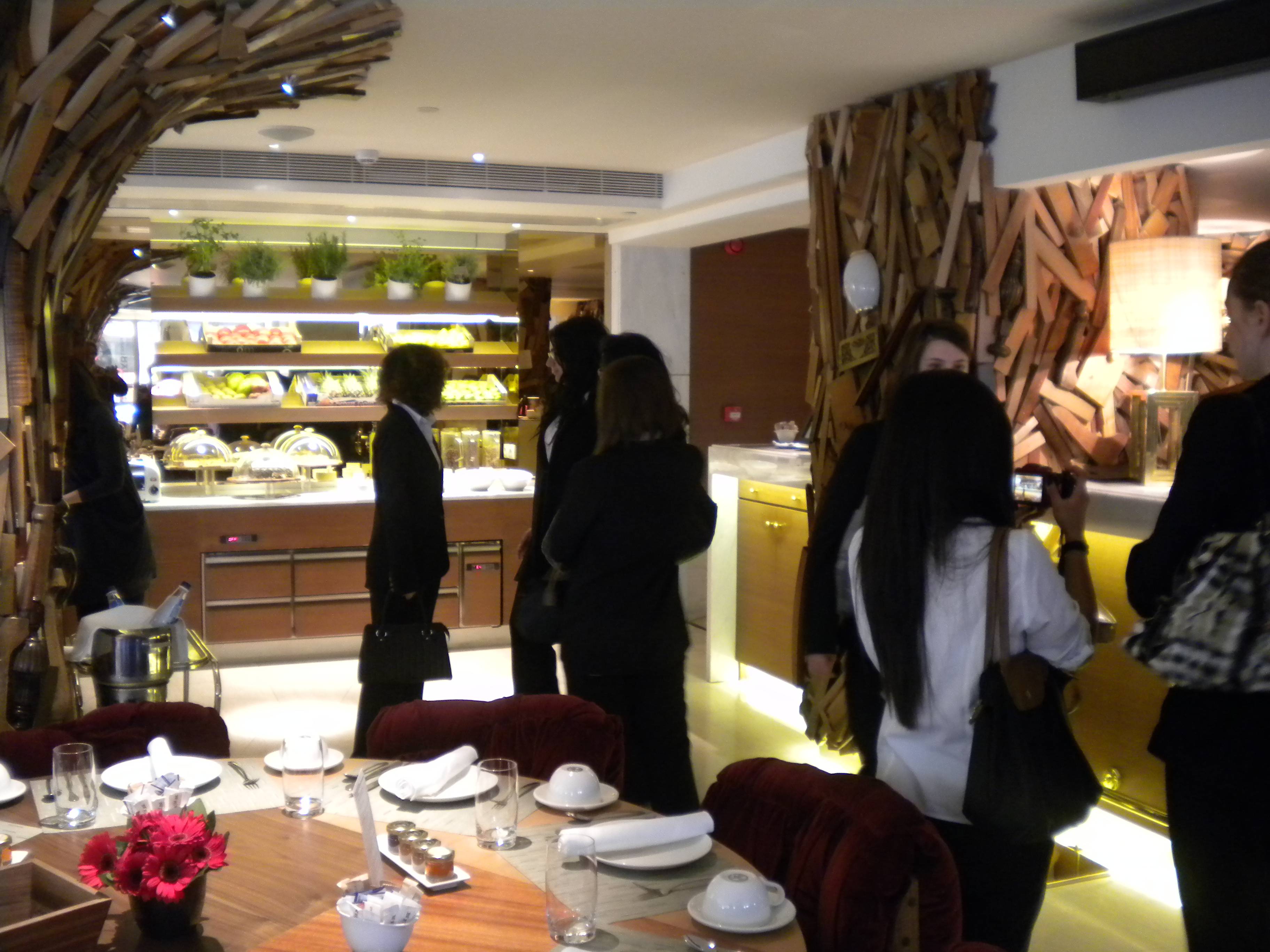 Οι σπουδαστές ξεναγήθηκαν στους χώρους του συγκροτήματος από την κ. Λισσαίου Events Manager και την κ. Παπαευσταθίου Guests Relations Manager του ξενοδοχείου και είχαν την ευκαιρία να γνωρίσουν από κοντά τους χώρους ενός design hotel που απηχεί με τον πιο έντονο ομολογουμένως τρόπο, τη φιλοσοφία διακόσμησης του χώρου, των διεθνώς γνωστών αρχιτεκτόνων αδελφών Campana, οι οποίοι επηρεασμένοι από το Βραζιλιάνικο καρναβάλι, με δημιουργίες από έπιπλα έως παπούτσια, εμπνεύστηκαν και από την Ελληνική παράδοση. Με την βοήθεια των φοιτητών του Πανεπιστημίου της Θεσσαλίας, δημιούργησαν χειροποίητες καρέκλες και φωτιστικά ενώ διατήρησαν μερικά χαρακτηριστικά του κτιρίου, όπως η μαύρη μαρμάρινη σκάλα.