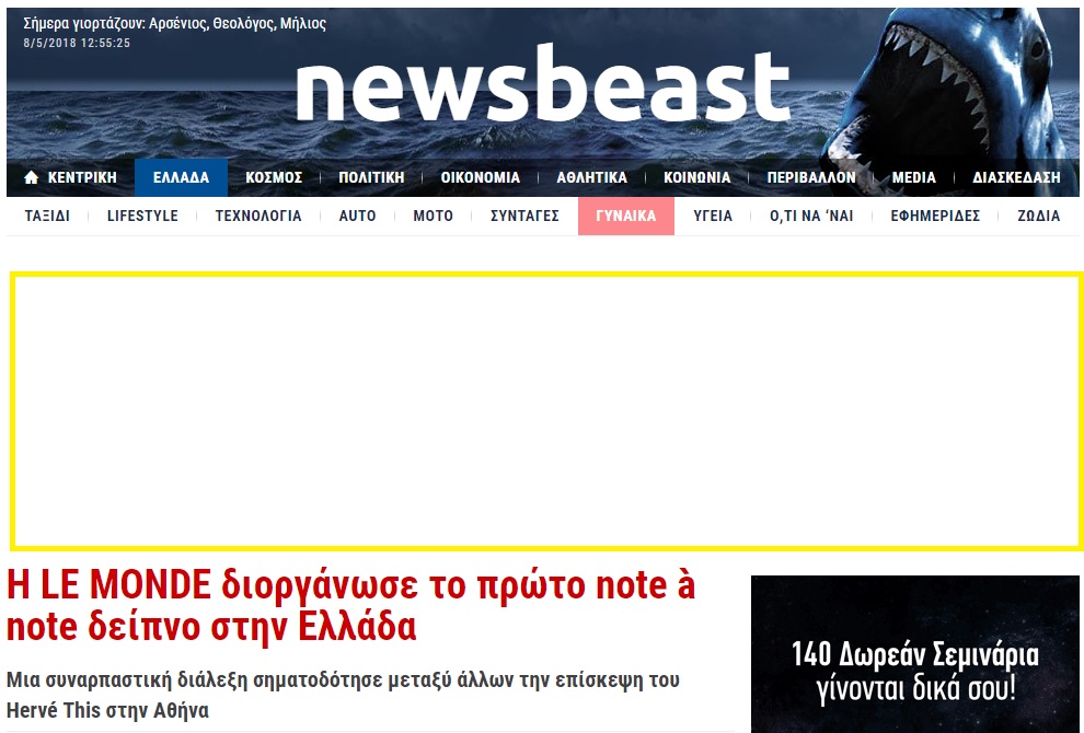 Με θέμα «Μοριακή Γαστρονομία: από τη μοριακή κουζίνα στην κουζίνα note à note, το παρελθόν και το μέλλον», ο διεθνούς φήμης φυσικοχημικός και δημιουργός της Μοριακής Γαστρονομίας, παρουσίασε την κουζίνα «note à note», μια καινοτόμο επιστημονική ιδέα με γαστρονομικές, οικονομικές, κοινωνικές και ανθρωπιστικές προεκτάσεις. Δείτε το άρθρο από το newsbeast.gr